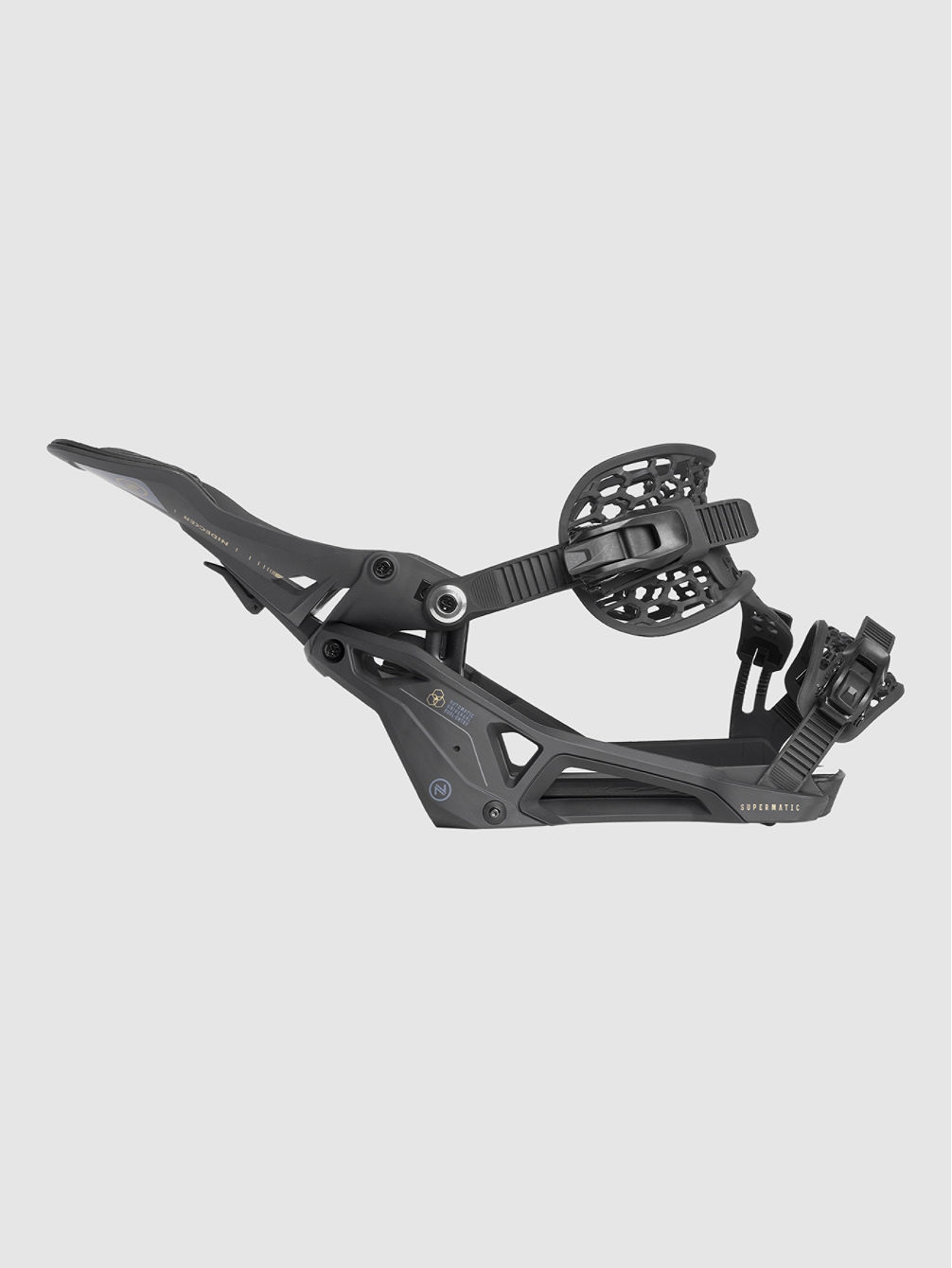 Supermatic - die erste automatische Bindung, die mit jedem Boot funktioniert. Nach Jahren der Entwicklung ist sie da: die Nidecker Supermatic. Es ist die erste universale, automatische Dual Entry Bindung. Du kannst sie mit jedem Boot verwenden und je nach Bedingungen und Terrain, deine Einstiegsart wählen. Für Piste und Park steigst du einfach in die Bindung und sie schließt sich von selbst. In unwegsamen und steilen Gelände lässt sie sich mit hochwertigen AuxTech Straps schließen. Nideckers Teamrider lieben diese mittelharte All-Mountain Bindung und nutzen sie von Piste bis Powder.HighbackNidecker hat ein spezielles Drop-In-Tech Highback entwickelt. Du steigst mit deinem Fuß in die Bindung und aktivierst damit automatisch das Fersenpedal. Das Highback klappt nach oben und schließt sofort. Mit einem simplen Hebel lässt es sich auch, genauso schnell und einfach wieder nach unten klappen und dich aus der Bindung aussteigen. Das Design des Nylon Asym Hadron Highback sitzt perfekt, hat einen reaktionsschnellen Flex und einen individuell einstellbaren Forward Lean.BaseplateDie brandneue Baseplate besteht aus festem, Glasfaser-gefülltem Nylon und einer Slip-N-Grip Platte, die deinen Boot noch leichter in die Bindung gleiten lässt. Am Heelcup sorgt eine Walze für reibungsloses Auf- und Zuklappen des Highbacks.StrapsDie Straps haben das gleiche, bequeme AuxTech Design wie traditionelle Bindungen. Einmal mit den Locking Slap Ratschen aus Aluminium eingestellt, sitzen sie ideal und du kannst über das Highback einsteigen. Erfordert es das Terrain, öffnest du die Straps und nutzt sie wie eine klassische Bindung. Dieses System funktioniert mit Boots von jedem Hersteller.
