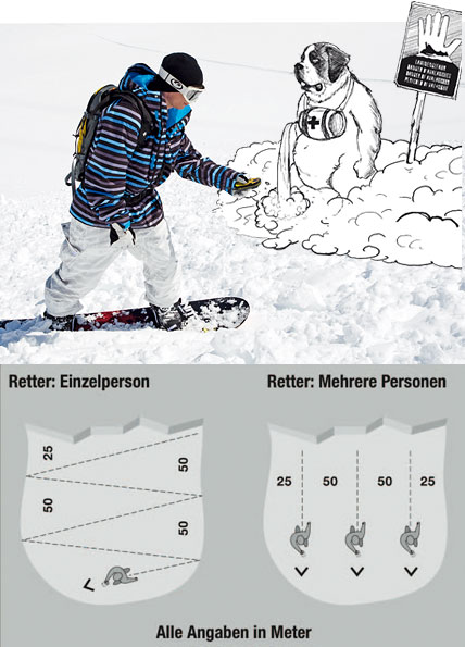 Was macht der Retter auf dem Bild falsch? Man sucht doch nicht mit Board an den Füssen! Doch, wer von oben mit der Suche anfangen kann, behält das Board erst mal an. Laut Airport Approach soll es am Anfang ja schnell gehen. Was ist dann falsch? Der Retter hält sein LVS-Gerät auf Hüfthöhe und konzentriert sich nur auf das Display. Aber in der Anfangsphase empfängt er kein Signal, das Display zeigt folglich nichts an. So geht’s richtig: das auf Suchmodus geschaltete LVS-Gerät wie ein Handy ans Ohr halten und den Blick auf den Lawinenkegel richten, um eventuell einen Arm, der aus dem Schnee ragt, sehen zu können. Mit dem LVS am Ohr den Lawinenkegel in zügigen Zickzack-Kehren abfahren (oder rennen), bis man ein Signal empfängt – also einen Piepston hört. Der Abstand zwischen den Kehren sollte zwischen 30 und maximal 50 Metern liegen (je nach Reichweite des Geräts).