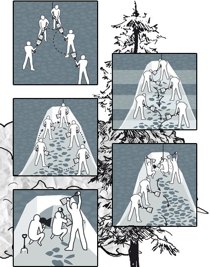 Geschaufelt wird in Paddelbewegungen, also von oben herab und mit Einsatz des gesamten Körpers. Die Vorderen stechen Schneeblöcke weg und arbeiten sich entlang der Sonde in die Tiefe. Die Hinteren schaufeln den Schnee weg