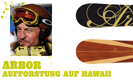 Nachhaltigkeit auf die Fahne geschrieben hat sich auch der Skate- und Snowboard-Hersteller Arbor. „Ein komplett ,grünes‘ Produkt herzustellen ist heute noch nicht möglich“, sagt Bob Carlson, einer der Gründer der Brand, „aber wir versuchen, Schritte in diese Richtung zu unternehmen.“ Ein Aspekt davon ist, dass laut Bob mindestens fünf Prozent des Gewinns an Umweltschutzorganisationen gespendet werden. Durch die Unterstützung eines Aufforstungsprojekts auf Hawaii zum Beispiel soll unter dem Strich eine negative CO2-Bilanz erreicht werden.