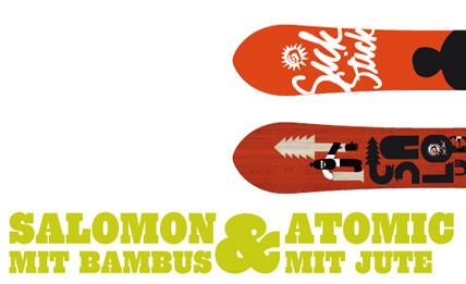 Zwei weitere Board-Hersteller, die mit Innovationen im nachhaltigen Bereich auf sich aufmerksam gemacht haben, sind Salomon und Atomic. Das Freeride-Board „Sick Stick“ von Salomon gewann den Volvo EcoDesign Award und setzt voll auf Bambus, die am schnellsten wachsende Pflanze mit ausgezeichneten Eigenschaften für den Board-Bau. Kern und Seitenwangen bestehen aus Bambus und in jedem Board ersetzen 400 Gramm dieses Holzes die Menge von 600 Gramm Plastik, Kunstharz und Fiberglass. Das Board soll nicht nur umweltfreundlicher, sondern auch robuster sein als herkömmliche Konstruktionen. Ausgeliefert wird das Teil in einer PVC-freien Hülle, die – Überraschung – ebenfalls aus Bambus besteht.
