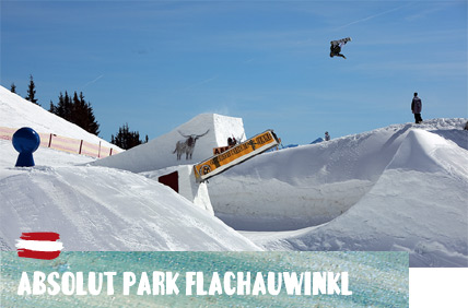 Der Absolut Park Flachauwinkl stellt ein wahres Paradies für Freestyler dar. Zehn verschiedene Line Kombinationen können darin gefahren werden und von der Half- und Quarterpipe über Kicker, Hips, Rails und Boxen stehen alle möglichen Obstacles zum Shredden bereit. Damit nicht genug: Der separate Stash Park wartet mit weiteren Holz-Obstacles auf und das Chillhouse direkt beim Absolut Park ist zudem mit Skate-Miniramp sowie Boulderwand zum Klettern ausgestattet. Eine kleine Armee von acht Shapern steht bereit, den Park zweimal täglich aufs Feinste herauszuputzen.
