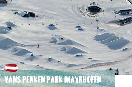 Mayrhofen ist nicht nur die Heimat der Zillertaler Schürzenjäger, sondern auch eines feinen Snowparks. Das Set-up des Vans Penken Park besteht aus fünf Lines mit unterschiedlichem Schwierigkeitsgrad. Hinzu kommen eine Halfpipe sowie der Kids Park mit eigenem Lift und elf Obstacles für den Nach- wuchs. Für die Instandhaltung des Parks stehen gan- ze acht Shaper und vier Pistenbully-Fahrer im Einsatz. Jeweils dienstags und samstags findet ein öffentliches Photoshooting statt, dessen Bilder am Abend online gepostet werden, und jeden Montag können Bretter ausgeliehen und vor Ort dem Praxistest unterzogen werden.