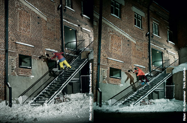 Dieses Rail hat die Crew bereits am ersten Tag entdeckt, und da noch absolut keine Jib-Spuren zu finden waren, schien es, als ob das Rail bisher von Snowboardern verschont wurde. Diese Schonzeit war nun aber vorüber. Da das Rail sehr steil war, keinen wirklichen Inrun besaß und ein erhöhtes Verletzungsrisiko aufbot, wagten sich Sebi und Flo erst am letzten Tag des Trips an die Bearbeitung. Für die Fahrer stellte der Inrun das größte Problem dar: Die Treppe aus Gitterstufen endet oben auf einer Art Gitter-Plateau, auf dem der Schnee aufgrund der Löcher im Gitter nicht richtig liegen blieb, weshalb keine Möglichkeit zur Anfahrt bestand. Zufälligerweise lagen in der Nähe einige Holzpaletten, die, wie man im Bild sehen kann, zur Anfahrt und zum Takeoff umfunktioniert wurden. Die Vorbereitungsdauer hierfür lag ebenfalls bei gut einer Stunde Schaufelzeit. Aber nicht nur die Fahrer, auch Fotograf und Fil- mer hatten ihre Probleme an diesem Spot: Die Backsteinwand der ehemaligen Brauerei war zwar schon ein gut aussehendes Motiv, jedoch sollte ein 30 Meter hoher Schornstein dem Bild den nötigen Schliff verpassen. Hätte Michael aber den Schornstein im Bild haben wollen, wäre der Fahrer zu klein gewesen.