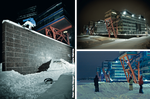 Diesen Spot hat die Crew jeden Tag im Vorbeifahren aus dem Auto gesehen. Die Skulptur steht in einem kleinen Park in der Nähe des Parlamentsgebäudes. Obwohl die Skulptur selbst zum Kicker umfunktioniert wurde und kein Takeoff mehr gebaut werden musste, nahm die Vorbereitungszeit gut eine Stunde in Anspruch. Da der Schnee rund um die Skulptur fast kniehoch war, musste eine Gasse für die Anfahrt frei geschaufelt werden. Den aus dem Weg geräumten Schnee schütteten die Jungs noch zusätzlich in die Landung, damit die Flat Bomb doch etwas abgefedert würde. Ein weiteres Problem war die Anfahrtsgeschwindigkeit: Durch die enorme Kälte pappte der Schnee massiv und so musste sich Fotograf Michael im nahe gelegenen Friseursalon zwei Eimer Wasser organisieren, um die Anfahrt eisig und so schneller zu machen. Das „Banshee Bungee“ wurde wie im Bild zu sehen an einem anderen Pfeiler der Skulptur befestigt. Da die Anfahrt gut 40 Meter lang war, musste das Bungee-Seil von vier Leuten angezogen und zum am Ende des Inruns sitzenden Fahrer gebracht werden.
