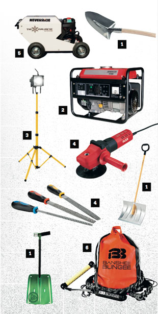 1. Je nachdem wie viel Equipment man mitschleppen kann, sollte man gute Schaufeln – am besten aus Metall – mitnehmen. Schnee- und Gartenschaufeln stehen meist in Papas Garage (bzw. gibt’s im Baumarkt schon ab 15 Euro) und eine Lawinenschaufel (hier: K2 „Rescue Shovel Plus“, 74,95 Euro) sollte eh jeder Snowboarder besitzen.