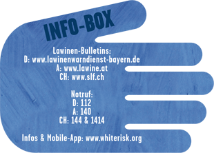 - Auf Gefahren-Anzeichen achten: Spontanlawinen, Risse, Wumm-Geräusche