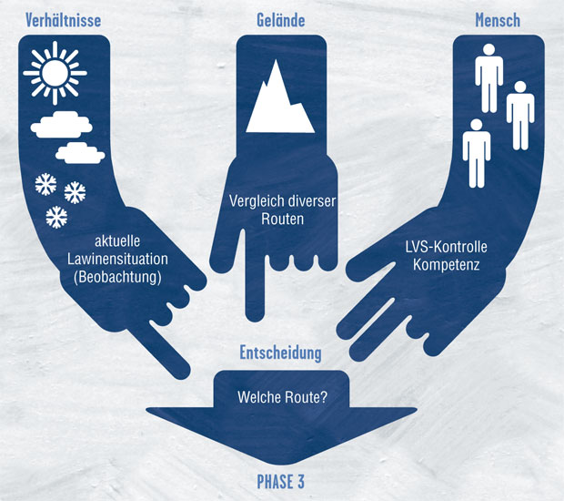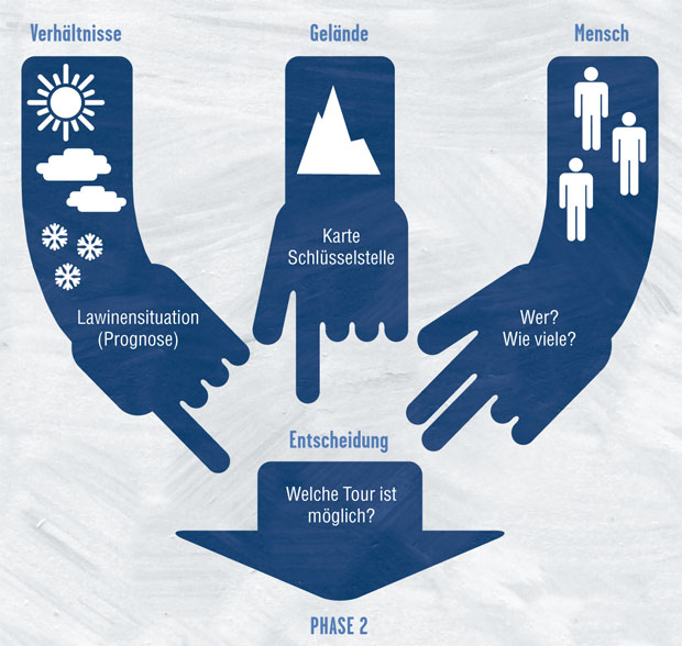 In dieser Phase wird geklärt, welche Region geeignet ist bezüglich Lawinensituation und Wetter, welche Abfahrten möglich sind, wer mitkommt und ob die Ausrüstung komplett und einsatzfähig ist.