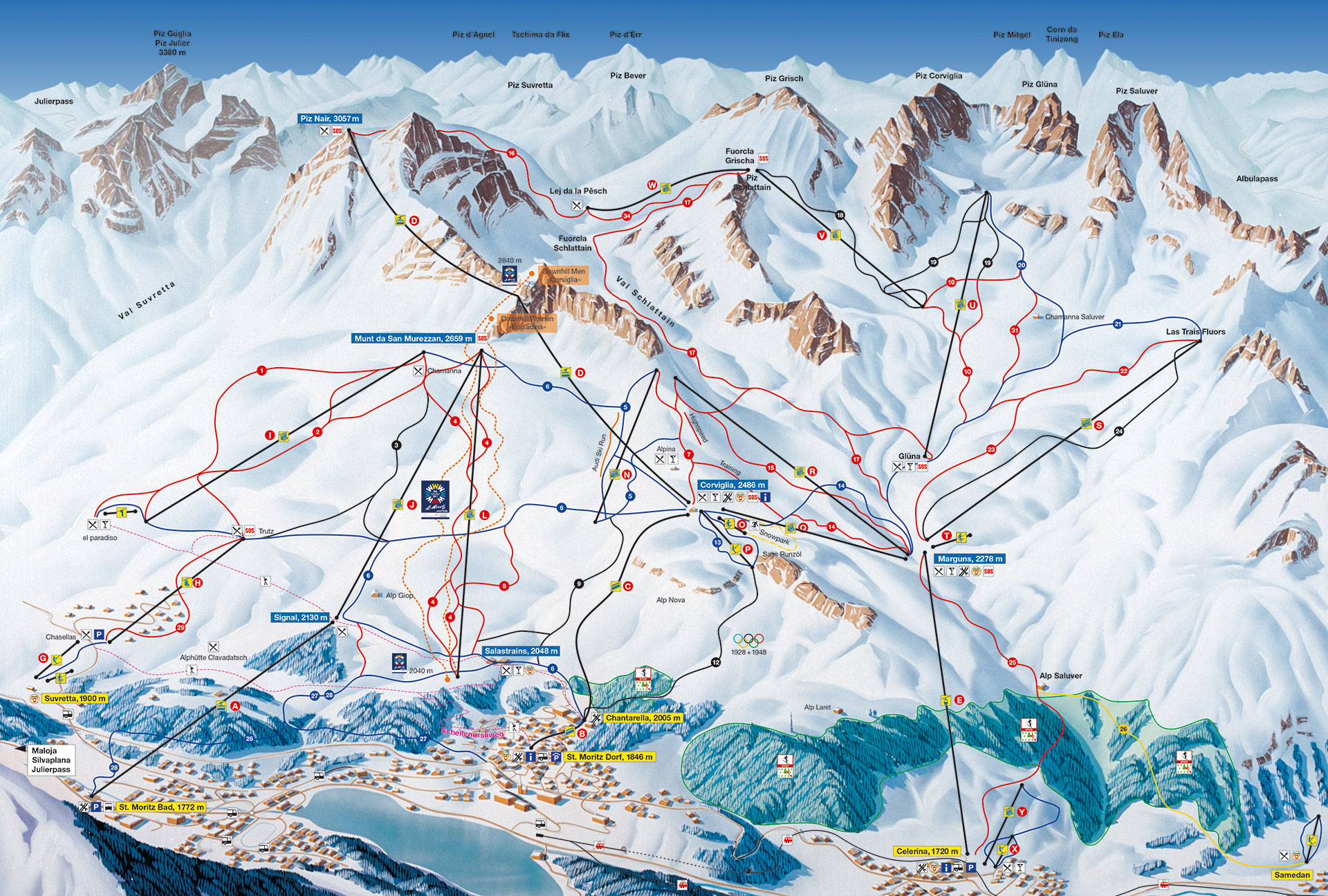 Optionen, seine Spuren im Powder zu hinterlassen, gibt es im Gebiet Corviglia viele – die anspruchsvollsten Runs erschließen sich dabei von der Bergstation des Piz Nair mit seinen 3.057 Metern. Zum einen die Westabfahrt, auf der man zunächst ein paar Meter auf der Piste Richtung Nordwesten zurücklegt, um dann seinen Weg südwestlich Richtung La Foppa fortzusetzen. Durch einen felsdurchsetzten Steilhang und Felsbänder gelangt man schließlich ins Suvretta-Tal, dem man über die Alp Suvretta nach Futschöls folgt, um dann entlang der Strasse den Weg zurück ins Gebiet zu finden. Die Ostflanke unterhalb der Gondelstation am Piz Nair ist mit rund 800 Höhenmetern zwar etwas kürzer, aber aufgrund des ebenfalls felsdurchsetzten, steilen Geländes nicht weniger fordernd. Eine sichere Fahrtechnik ist daher Grundvoraussetzung. Wer im Tiefschnee nicht versiert ist, kann im niedriger gelegenen Teil des Gebiets an seinem Können feilen.