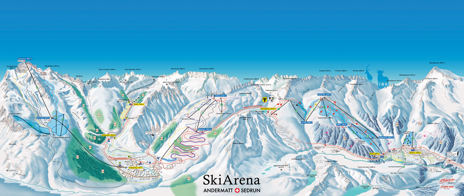 Die 120 Pistenkilometer der Skiarena Ander- matt-Sedrun bieten Pisten in allen Schwierigkeitsgraden: Erfahrene Schneesportler können sich auf den Pisten am Gemsstock austoben, für Familien sind die einfacheren Pisten auf der Gurschenalp oder in Sedrun besser geeignet. Für Anfänger gibt’s zwei passende Lifte in Realp. Die Matterhorn-Gotthard-Bahn, mit der man von Sedrun nach Andermatt fährt, ist ebenfalls im Ticketpreis enthalten.