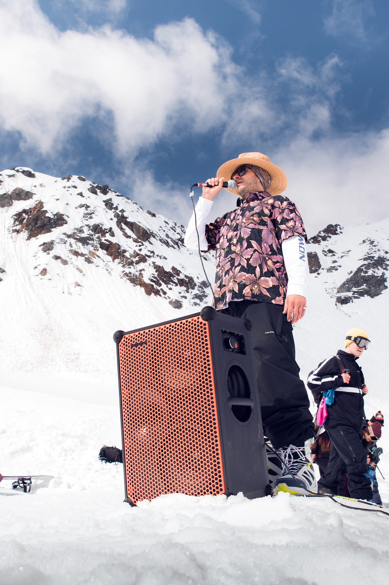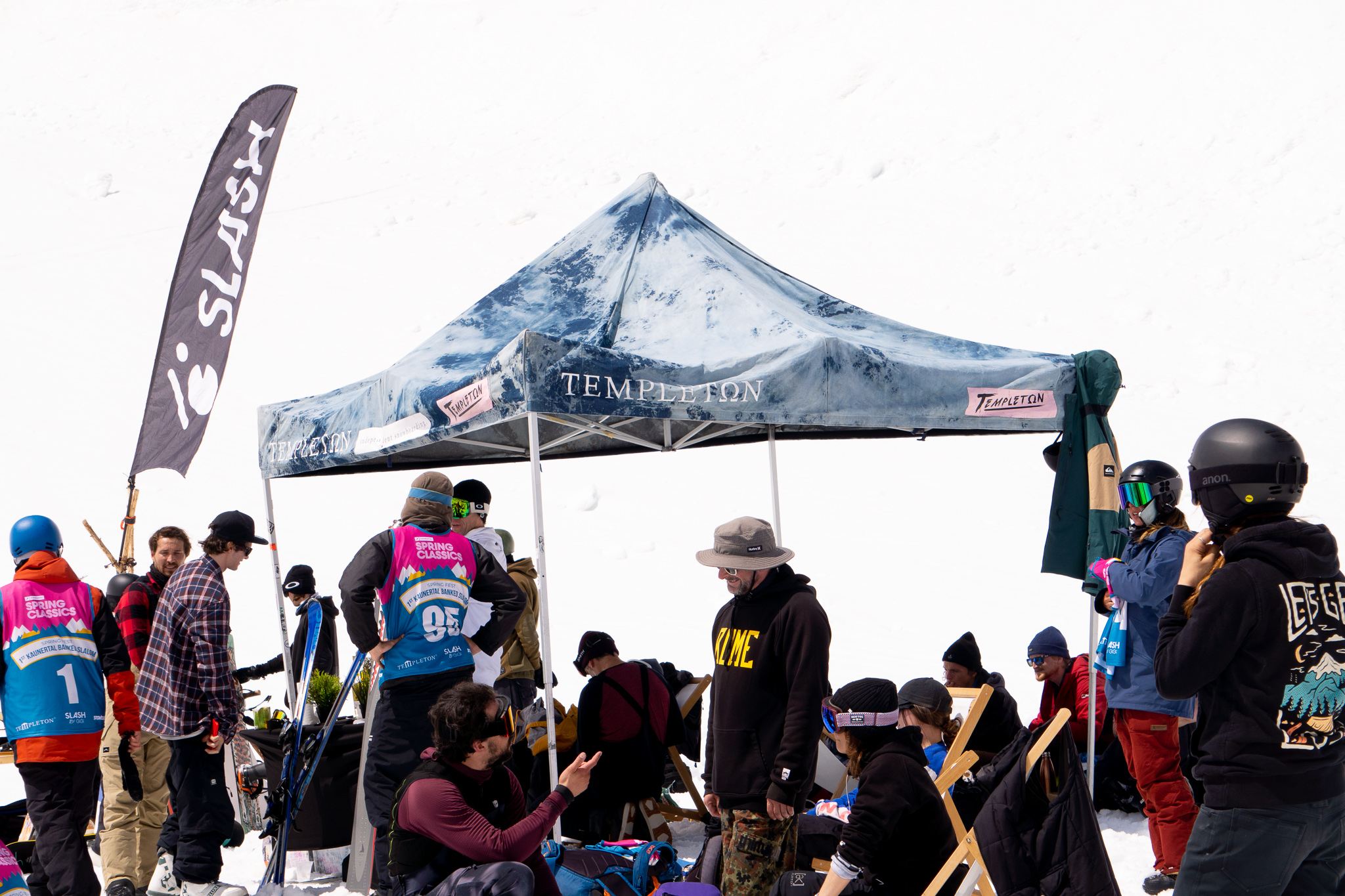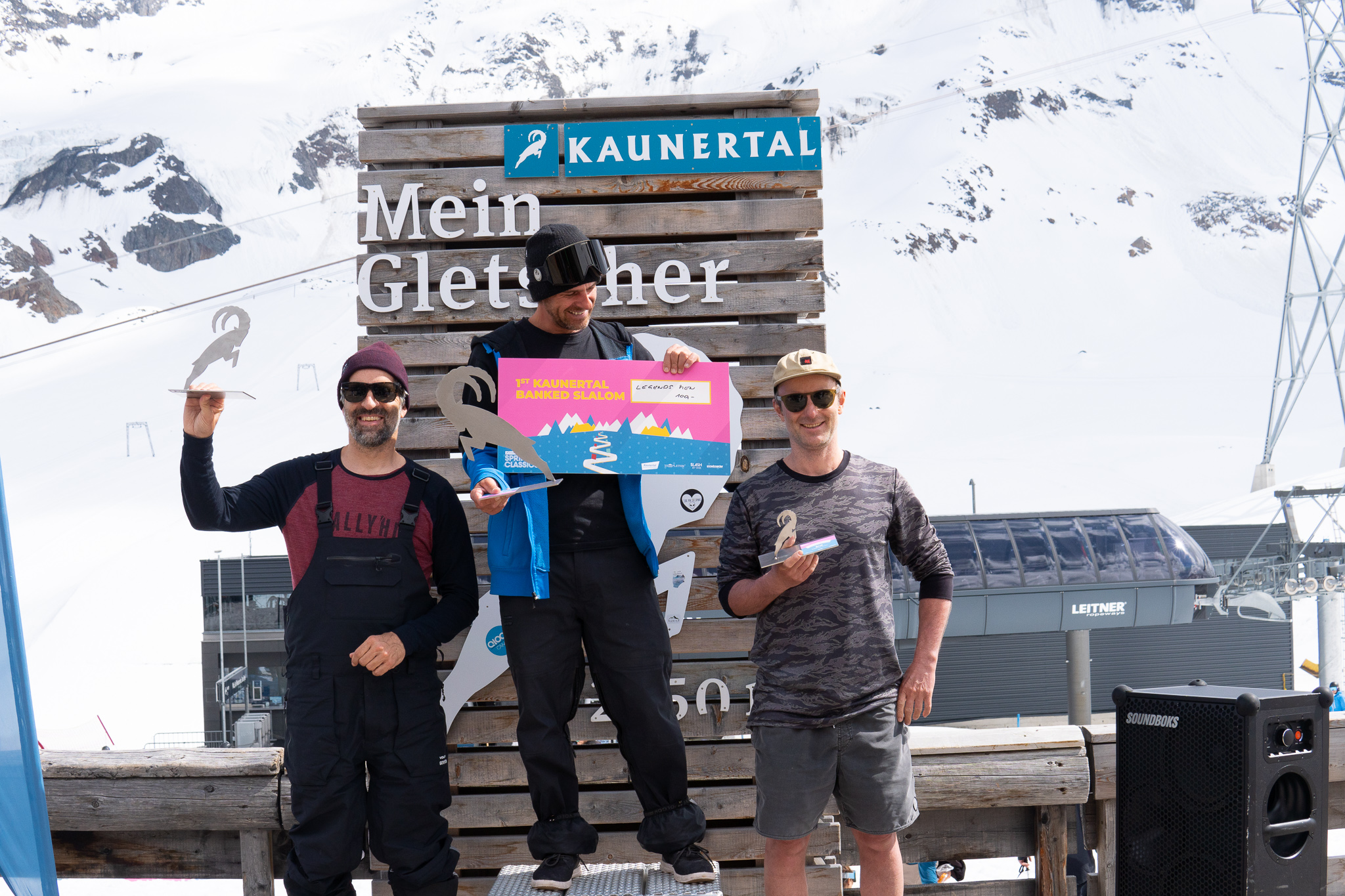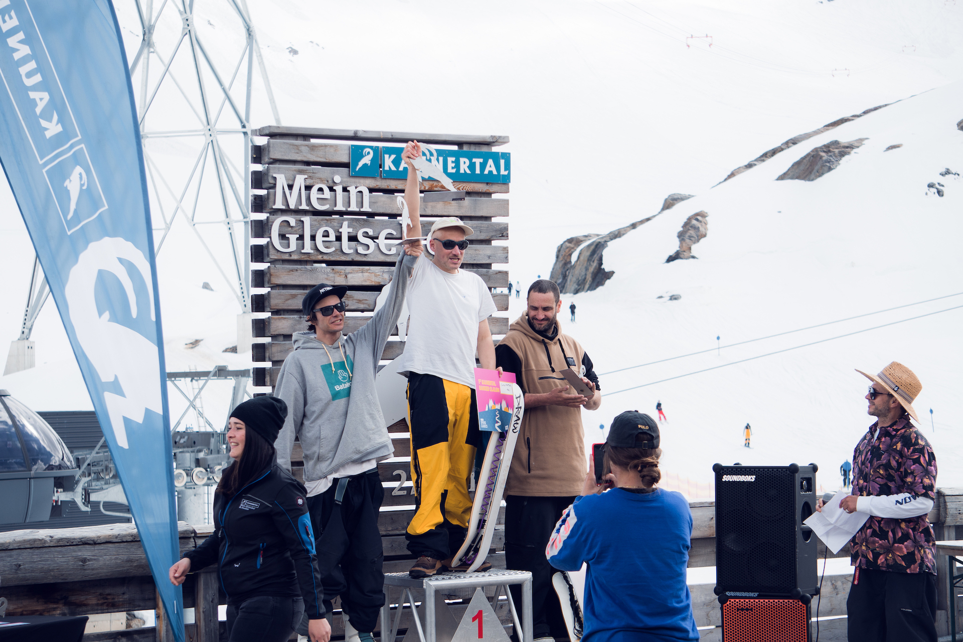 Namen wie Peter Bauer, Gigi Rüf, Roli Tschoderer und Fabi Fraidl, der sich kurzerhand entschied als einer von 3 Snowskatern zu starten und direkt den 2. Platz in dieser Kategorie abräumte, waren am Start um sich im Banked mit den anderen Teilnehmern zu messen. Schon bei der Akkreditierung und dem Handover der Bibs, die alle Teilnehmer als Trophäe mitnehmen durften, waren die Spring Vibes deutlich spürbar. Kein Wunder also, dass schon ab 11 Uhr vormittags viele der Rider nur mit Shirt oder Hoodie bekleidet mit einem breiten Grinsen im Gesicht in den Banked droppten. Die perfekten Boards dafür lieferte Slash mit einem Teststand am Ziel des Banked Slaloms. Wann hatte man sonst schonmal die Chance zusammen mit Gigi Rüf über dessen Brand zu quatschen und sich ein Testboard von ihm montieren zu lassen?