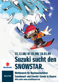 Am Abend auf der „Suzuki Snow Jam Party“ waren alle Teilnehmer bester Laune und tanzten zum Sound von Cajus einem der Münchner Blumentöpfe. Gemeinsam feierten sie Bernhard Staudt und Jenny Lied die sich von nun an als Suzuki Snowstar bezeichnen dürfen. Sie hatten im Mojopark ihre härtesten Tricks ausgepackt und ihr Gesamteindruck sowie die Variation der Runs überzeugte.