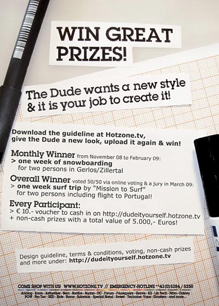„Malen nach Zahlen“ – das war einmal…im 21.Jahrhundert greift der ambitionierte Künstler zu Photoshop & Co, verpasst dem Hotzone.tv Dude im Rahmen des „Dude it Yourself“ Design Contest ein neues Outfit und gewinnt als Februar Monatssieger eine Woche shredden in Gerlos (Zillertal), und im besten Fall gleich dazu als Overall-Winner einen Surftrip nach Portugal. So einfach ist das – isn´t it?