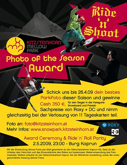 Das Foto muss in der aktuellen Saison im Zeitraum vom Oktober 2008 bis April 2009 im Kitzsteinhorn Mellow Park fotografiert worden sein. Jeder Teilnehmer kann maximal drei Fotos (jeweils als JPG mit maximal 2 MB) einreichen. Eine Jury bewertet dann alle rechtzeitig eingesandten Fotos. Neben dem Preisgeld gibt es Sachpreise von DC und Roxy zu gewinnen. Unter allen Teilnehmern werden zudem elf Kitzsteinhorn-Tageskarten verlost. Die Award Ceremony findet dann am 02. Mai 2009 um 23.00 Uhr im Rahmen der Ride’n’Roll Party auf der Burg Kaprun statt.