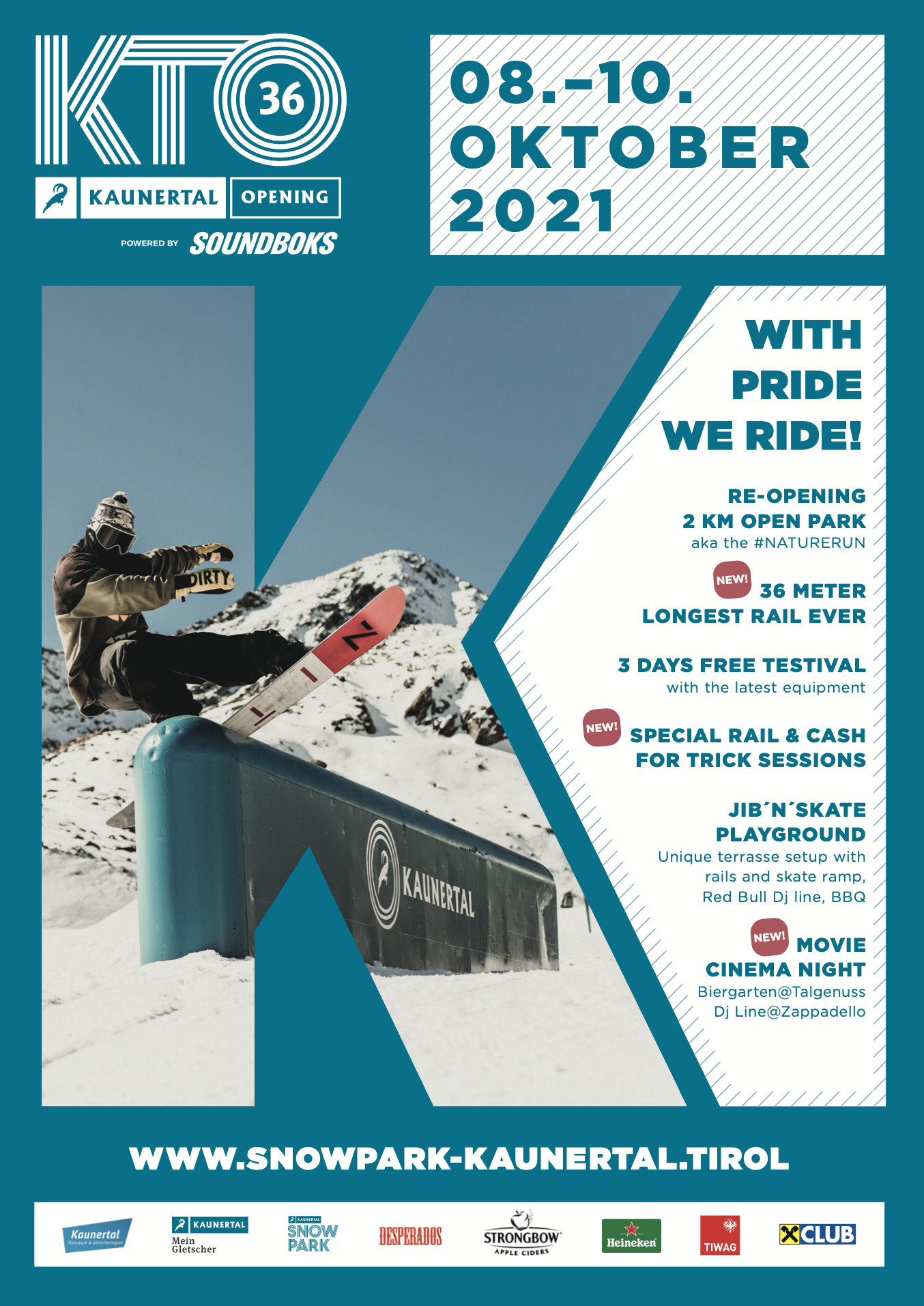 Das Kaunertal Opening aka KTO setzt seine Tradition fort und erfindet sich nach den vergangenen schwierigen Monaten wieder neu. Mit der 36. Ausgabe des Opening-Klassikers werden zahlreichen neue Programmpunkte und Änderungen umgesetzt: neues Shape Team, neue Rails, neue Rail-Farben, neuer Hauptpartner und ein abwechslungsreiches Programm mit einigen Aushängeschildern der Szene als Hosts. Snowpark Kaunertal ist immer eine Reise wert – heuer mehr denn je. So let’s go!