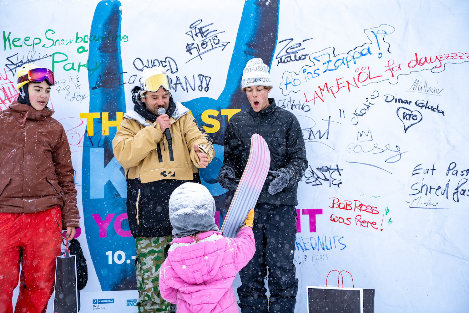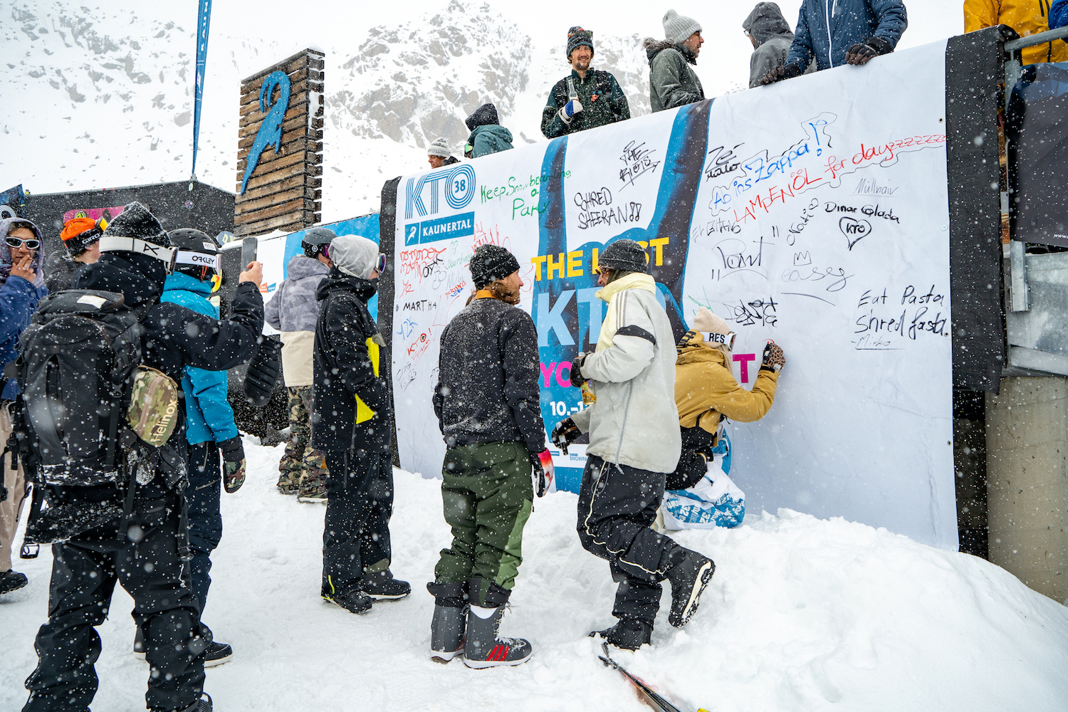 Es war ein Miteinander von Jung und Alt, Pro’s und Beginner:innen, Ski und Snowboard – dies spiegelte sich auch auf der riesigen KTO-Memoire-Wand wider, welche übersät war mit Unterschriften, Glückwünschen und Erinnerungen an das Kaunertal Opening.