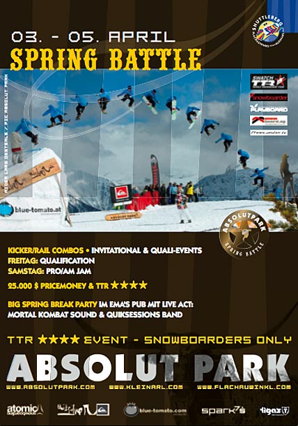 Wie bereits angekündigt, fällt nächste Woche der Startschuss zum mittlerweile siebten Spring Battle im Absolut Park (Flachauwinkl Kleinarl / AUT). Vom 03.-05. April gibt es einen feinen TTR 4Star Slopestyle Contest mit zahlreichen Shred-Grössen: Air & Style Gewinner Colin Frei (K2/SUI) wird vor Ort sein, ebenso der amtierende King of Popcorn Seppe Smits (BURTON/BEL), Wängl Tängl Winner 06 und Spring Battle Champion 07 Ville Uotila (ATOMIC/FIN) – alle werden sich im Absolut Park um 25,000$ Preisgeld duellieren.