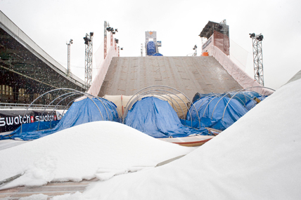 Während die Alpen auf den ersten Schneefall warten, schüttelt Frau Holle ihre Kissen derzeit heftig über Berlin. Grund dafür sind 20 der Top-Shredder, die morgen natürlich nicht auf den hier noch sichtbaren Brettern, sondern auf frischem, weißen Schnee landen wollen.