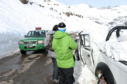 Eine Begegnung der anderen Art haben wir dann am Nachmittag. Ein schwer beschädigtes Autowrack an der Seite der Strasse erinnert uns an unseren Leihwagen und sofort beginnt ein lustiges Posen und abhängen rund um das verformte Stück Metal. Das entgeht der chilenischen Polizei nicht und 10 Minuten später kommen die Ordnungshüter schon mit Blaulicht daher. Erste Amtshandlung: Eric Themels Rucksack durchsuchen und feststellen, ob nicht irgendwelche Ersatzteile in meinen Pack gewandert sind. Belustigt stehe ich daneben und weise den Cop darauf hin, dass zwischen meiner Schaufel und der Sonde eventuell ein Zylinderkopf oder ein Turbolader versteckt sein könnte! Schweigen ist die Antwort und mit einem grimmigen Look im Gesicht steigen die Cops wieder in ihr Auto und suchen das Weite.