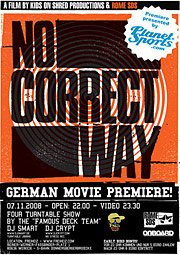Am Freitag, den 07.11.2008 steigt zur Deutschland-Premiere von No Correct Way eine Party in bekannter Rome Manier die sich gewaschen hat und die es nicht zu verpassen gilt. Zusammen mit dem Partner Planet Sport lädt ROME SDS zur Abfahrt in die Räumlichkeiten der Freiheizhalle mit den DJ´s Smart & Crypt.