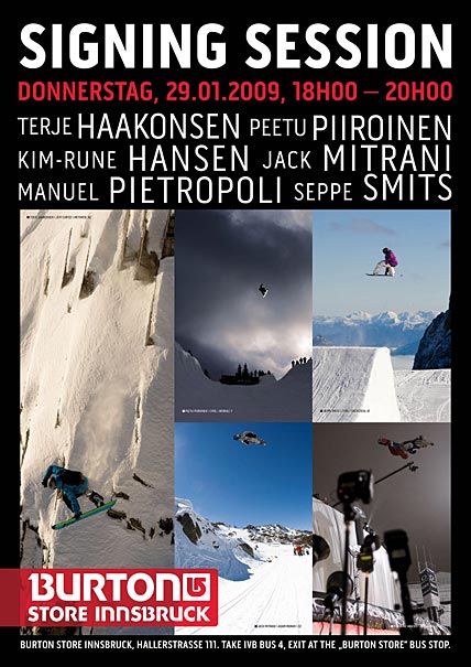Am Donnerstag, 29.01.2009, bietet der Burton Store Innsbruck ein besonderes Highlight. Anlässlich des am kommenden Wochenende stattfindenden Air & Style geben die Burton Fahrer Peetu Piiroinen, Manuel Pietropoli, Jack Mitrani, Kim-Rune Hansen und kein geringerer als Terje Haakonsen himself dort eine Autogrammstunde. Genau genommen sind es sogar zwei Stunden, denn sie werden von 18:00h – 20:00h vor Ort sein. Die Zocker unter euch haben die Möglichkeit die Burton Pros herauszufordern – virtuell in „Shaun White Snowboarding“ auf der Konsole.