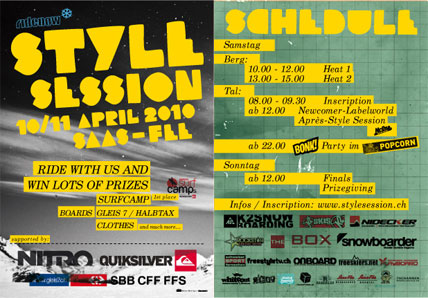 Die siebte Ausgabe der Style Session findet am 10./11. April 2010 in Saas-Fee statt. Das erfolgreiche Crew-Battle geht dieses Jahr in die dritte Runde. Die Snowboarder treten am Samstag in dreier bis fünfer Crews in der Quali Jam-Sassion gegeneinander an. Zuschauer, Teilnehmer, Fotografen und Judges entscheiden, welche acht Crews sich für die Finals am Sonntag qualifizieren.