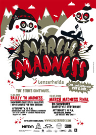 Am zweiten Eventtag, Samstag, 13. März 2010, wird mit dem March Madness Finale noch einmal draufgelegt. Unter dem Motto „Let the Madness continue…“ treten, nach zwei Qualifikationsruns, die Besten im grossen Head-to-Head Finale gegeneinander an. Neben dem üblichen Rahmenprogramm lockt besonders das Slopestyle-Finale: 2.500,- CHF Preisgeld gilt es zu verteilen. Die Siegerehrung findet direkt im Park statt, anschliessend trifft man sich in Parpan in der Obertor Bar, wo ab 22 Uhr zur After-Contest Party „Go and get mad“ geladen wird. Dem „Come-Together“ der Schweizer Freestyle-Szene steht bei der March Madness also nichts mehr im Wege!