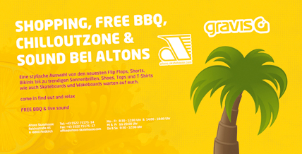 Wer es bis jetzt immer noch nicht geschafft hat Snowboardhose und -jacke gegen Shorts und T-Shirt zu tauschen, oder es nicht getan hat, weil er nicht das passende Sommeroutfit besitzt, sollte sich am 6. Juni auf den Weg nach Feldkirch machen. In Altons Skatehouse gibt es dann die neuesten Flip Flops, Shorts, Bikinis, Sonnenbrillen, Schuhe, Tops, T-Shirts undsoweiterundsofort…. Und da neben der neuesten Software natürlich die passende Hardware nicht fehlen darf, warten auch neue Skateboards und Wakeboards auf euch!