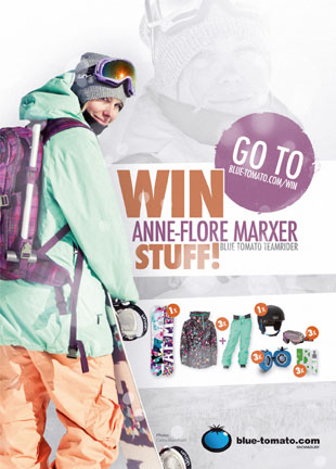 Ladys aufgepasst … Anlässlich des Neuzugangs von Anne-Flore gibt es auf der Blue Tomato-Webseite ein fettes Gewinnspiel! Unter anderem könnt ihr Anne-Flores Set Up inklusive AFM Snowboard, AFM Signature Billagbong Outerwear-Jacke und Hose sowie ihrem Signature Duft ‚Flore Ette’ von Les Ettes gewinnen. Weitere Infos zum Gewinnspiel und den Anne-Flore-Produkten auf www.blue-tomato.com/afm.