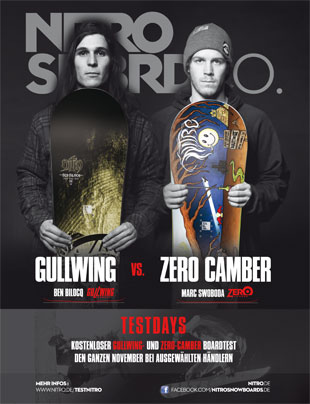 Die Gullwing- und Zero Camber-Boards von Nitro gibt es von 01.11.11 bis 31.11.11 kostenlos zum Testen bei ausgesuchten Händlern in Deutschland. Jeder Kunde hat die Chance für 2 Tage pro Person das Board seiner Wahl unverbindlich zu testen und sich selbst von den Vorspannungskonzepten zu überzeugen.
