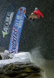 Der Quiksilver King of S.N.O.W Trick-Battle geht in die siebte Runde, Mathieu Crepel macht mit einem Cab 900 Mute eine...