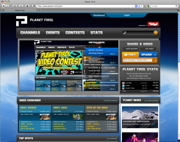 Vor knapp einem Jahr ging „Planet Tirol“ Online. Eine coole Online-Plattform für videobegeisterte Sportler zu schaffen, die ihre eigenen Actionclips posten und gleichzeitig Videos von anderen Usern ansehen und bewerten können. Zunächst waren die Snowboarder gefragt, ihr Können in Form von Videoclips zu zeigen, im Sommer kamen dann auch die Biker und Skateboarder.
