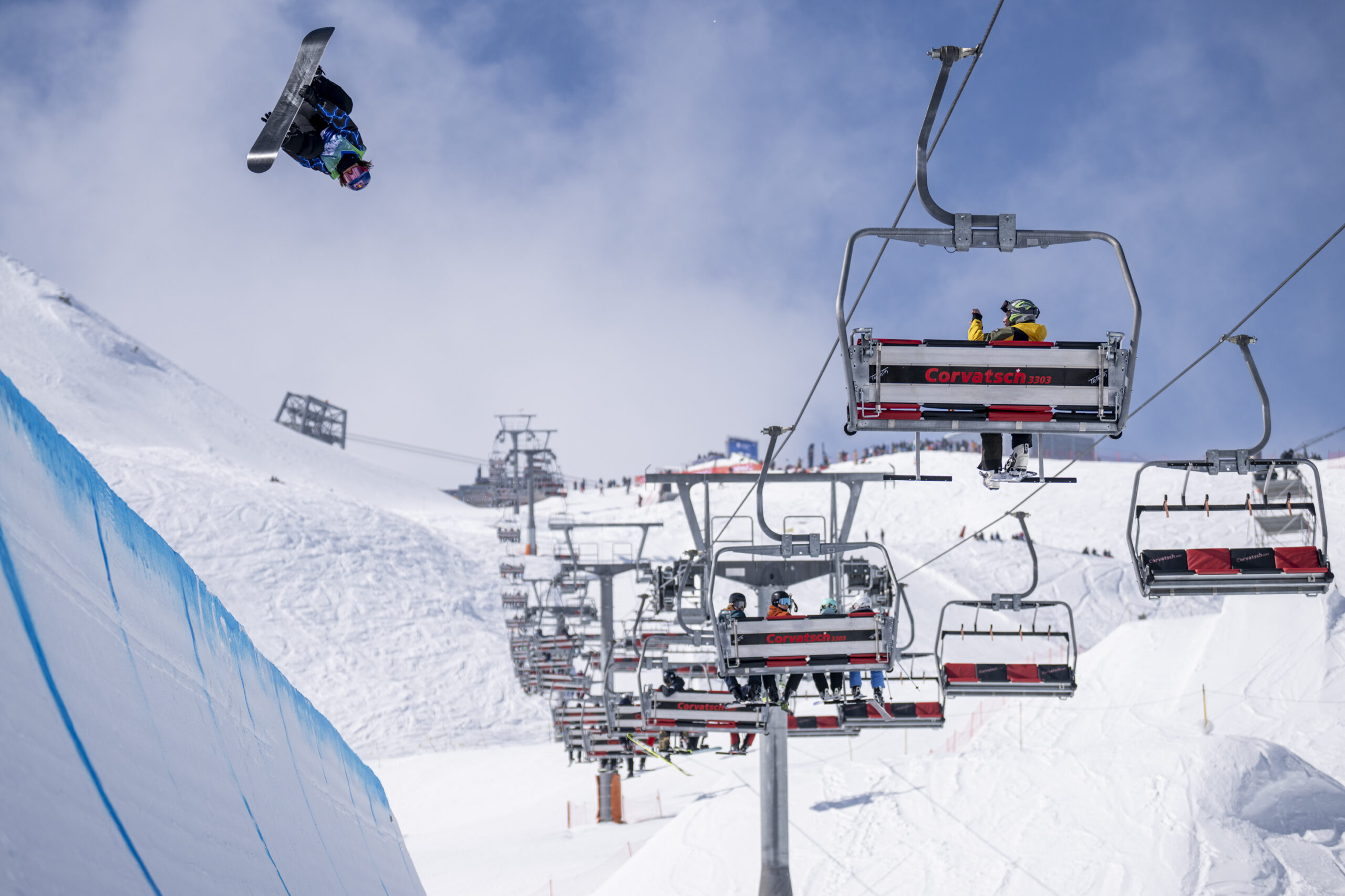 Bei Sonnenschein und traumhaften Panorama zeigen die 10 Frauen und 16 Männer im Corvatsch Park auf 2.700 m.ü.M Freestyle vom Feinsten.