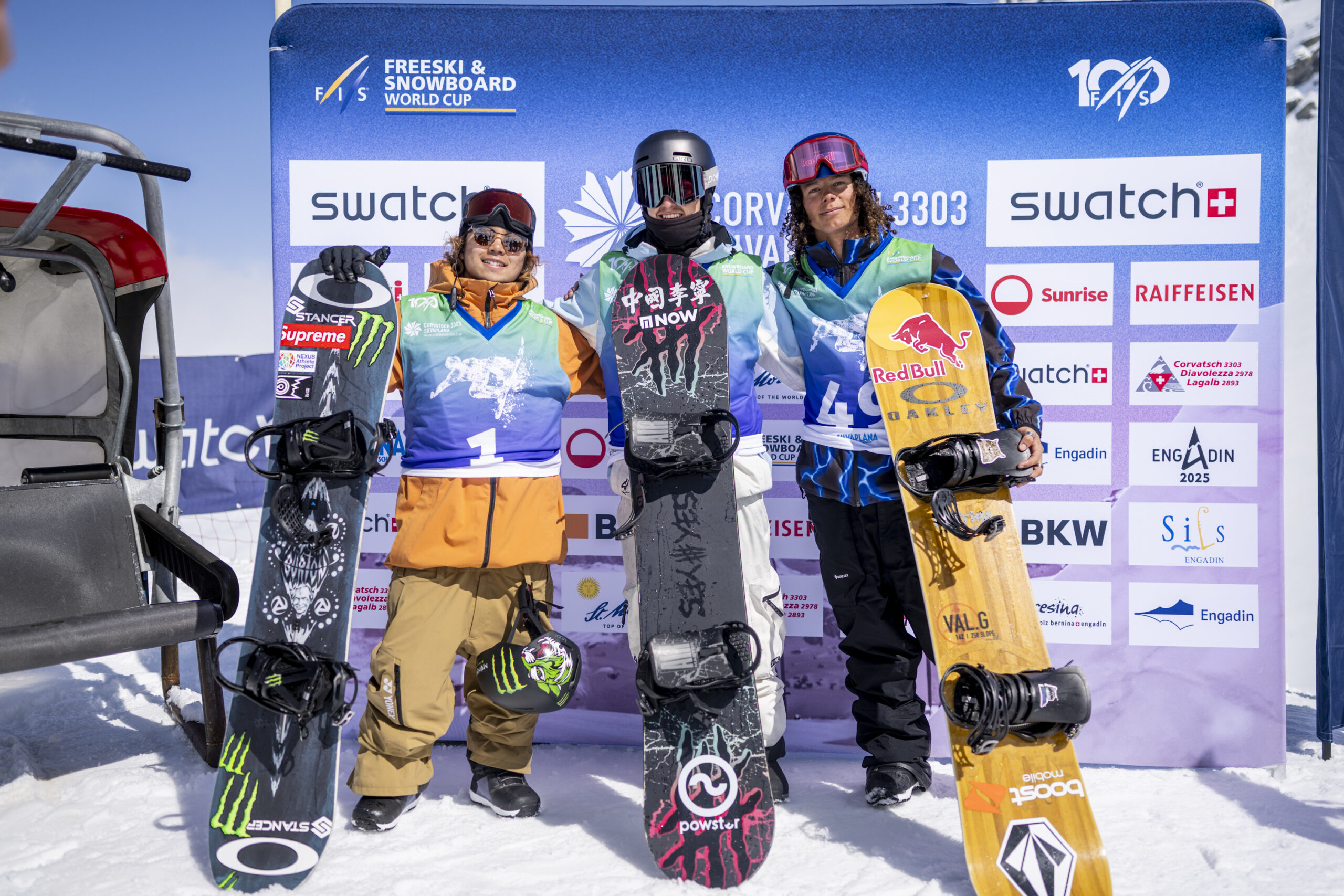 Das ist auch ihr drittes Podium in Folge in Silvaplana (3. Platz 2023, 1. Platz 2022). Der Slopestyle Kurs am Corvatsch liegt ihr: „Für den letzten Run ist es schön geworden, der Wind hat aufgehört, alle Mädels haben noch mal zulegen können. Ich freu mich, dass ich mit den zwei kleinen Gangstern am Podium stehe.“