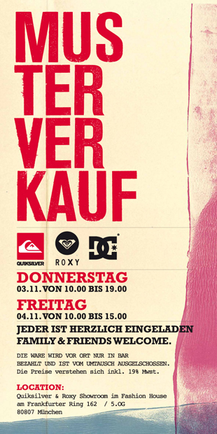 Wir sind alle herzlich eingeladen zum Musterverkauf von Quiksilver / Roxy und DC .