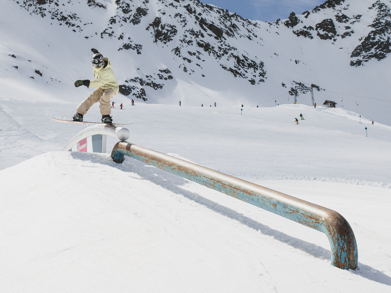 Sie ist zurück – die Halfmile-Jibline aka „the nature run“, die über die Karlesjochbahn erreichbar ist, garantiert den längsten Parkrun und bietet from top to bottom zahlreiche Möglichkeiten sich auf den Rails, Tubes und Boxen zu beweisen. Auch Kicker in verschiedenen Größen werden sich in der Line wiederfinden. Viel Abwechslung, viele Möglichkeiten garantieren viel Spaß!