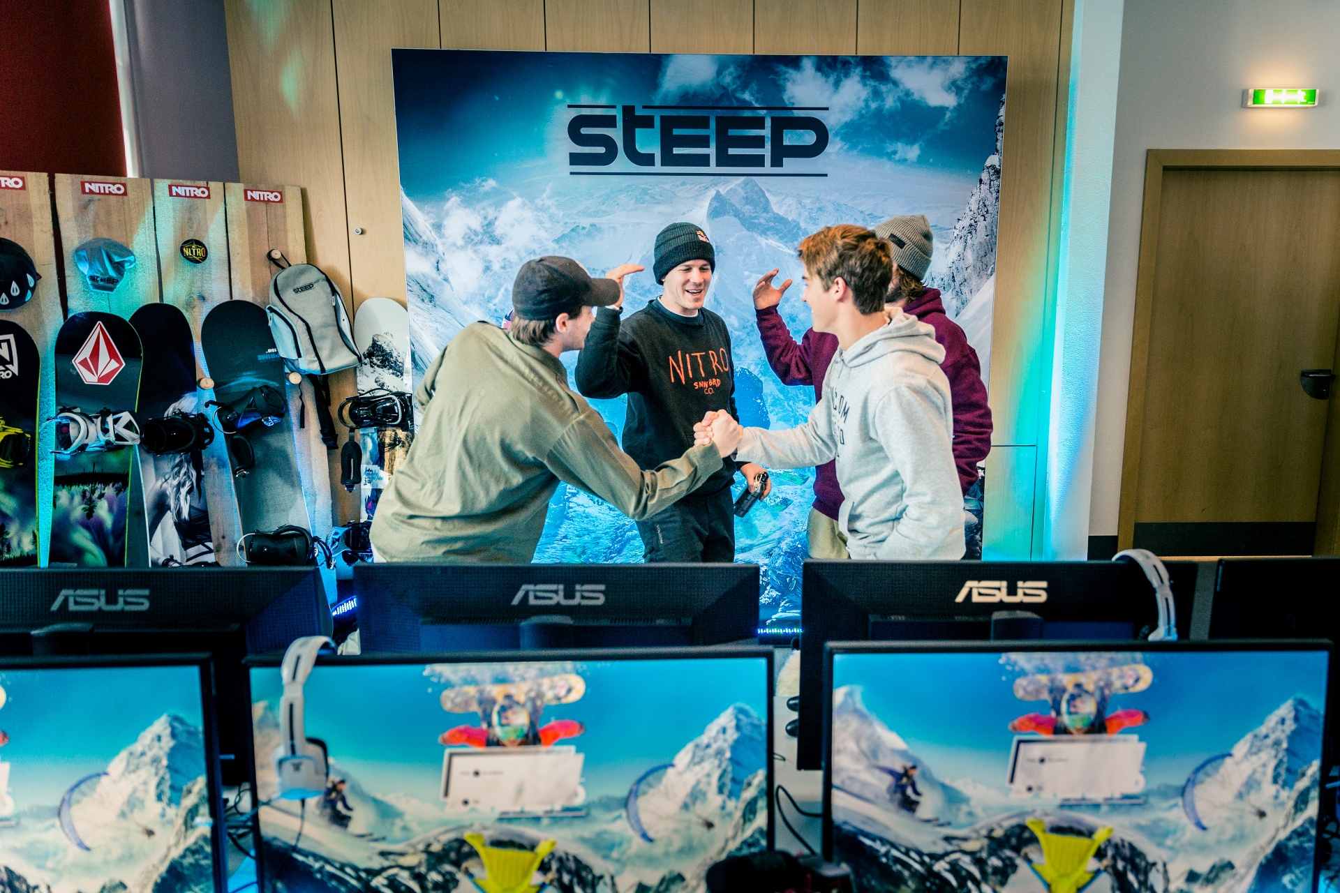Neben einer Auswahl an Herausforderungen, die es in der offenen Spielwelt von Steep zu bestehen galt, wurden unter Anleitung der Pros auch die realen Pisten des Wintersportgebiets mit dem Snowboard erkundet.