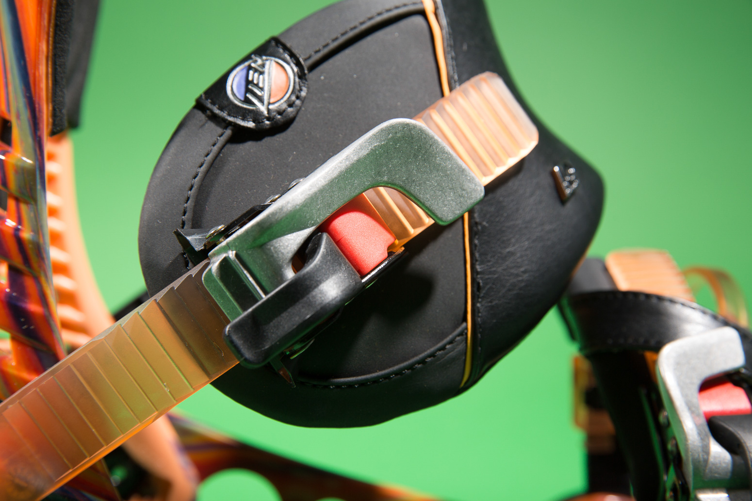 Sie hat die „Tripod“ Baseplate mit drei kleinen Urethan-Discs unter den Füßen beibehalten, die als Kontaktpunkte funktionieren. Dadurch hat die Bindung ein bisschen seitlichen Bewegungsspielraum, in Richtung Nose und in Richtung Tail und bringt dir ein surf-ähnliches Gefühl. Wenn du mehr Dämpfung benötigst, kannst du einfach einen schock-absorbierenden Polster unter die Baseplate schieben.