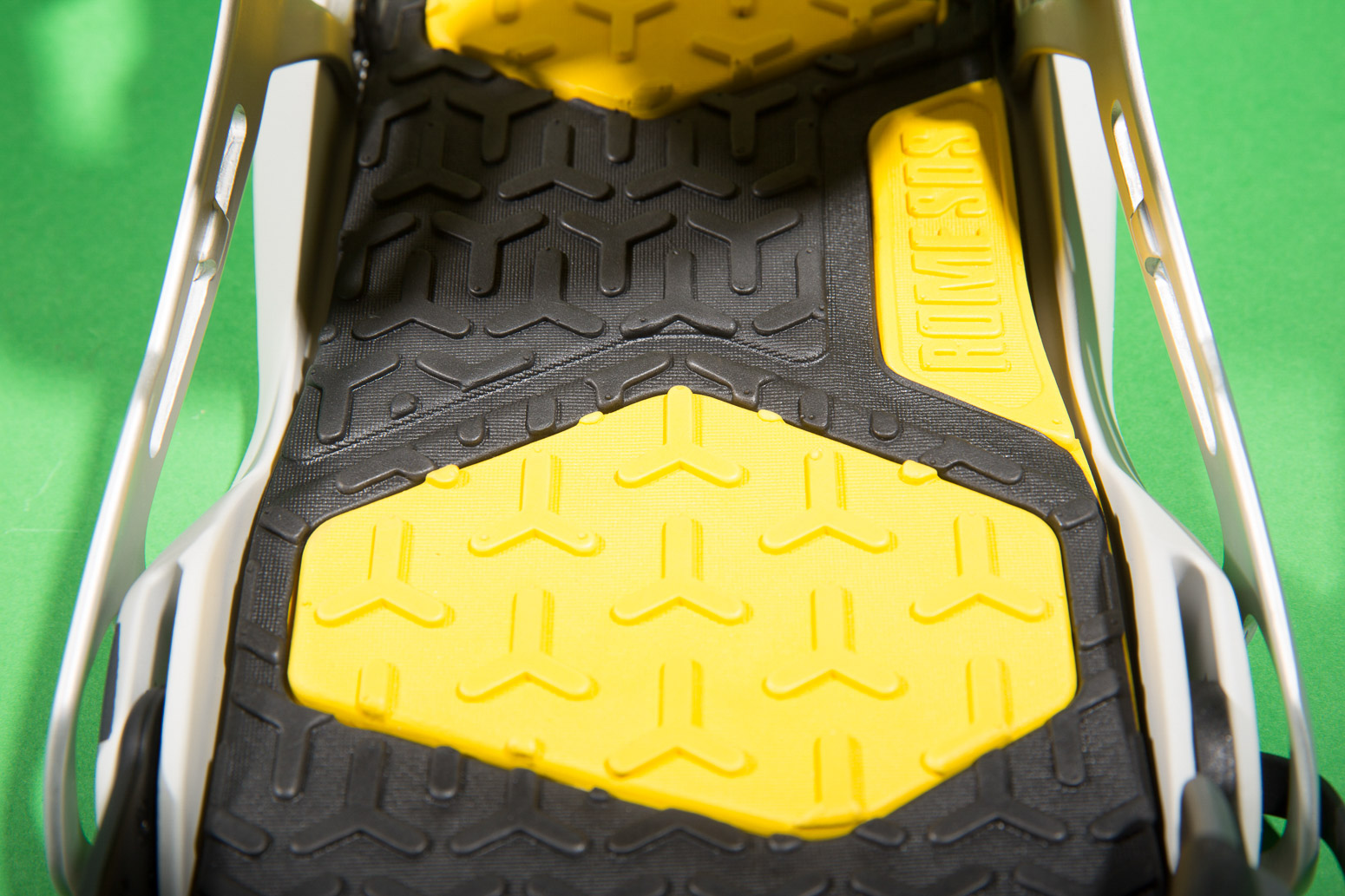 Sie ist ohne Frage robust genug für seine einzigartige Interpretation von high-end Freestyle und ist mit ihrer Aluminium-Schale reaktiv beim Kantenwechsel, aber bietet dir gleichzeitig seitlichen Flex. Dieser wird durch die „V-Rod“ Baseplate erreicht, einen Kanal, der Kontakt mit dem Board hat und unter deinen Füßen von Kante zu Kante verläuft, während der Rest der Bindung etwas erhöht ist.
