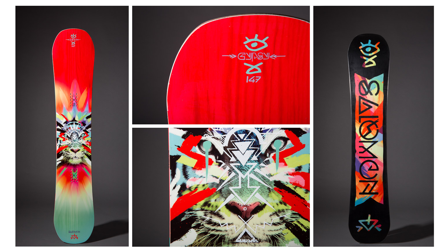 Das Salomon Gypsy ist schon lange beliebt unter freestyle-ambitionierten Mädels, nicht umsonst ist es ein langjähriger Favorit von Jenny Jones und Desiree Melancon. Obwohl es ein relativ konventionelles True Twin ist, war es schon immer aus einem Kilometer Entfernung erkennbar — woran die Artworks nicht ganz unschuldig waren — und die Grafik für 2015/16 sticht genauso ins Auge wie die der Jahre zuvor.