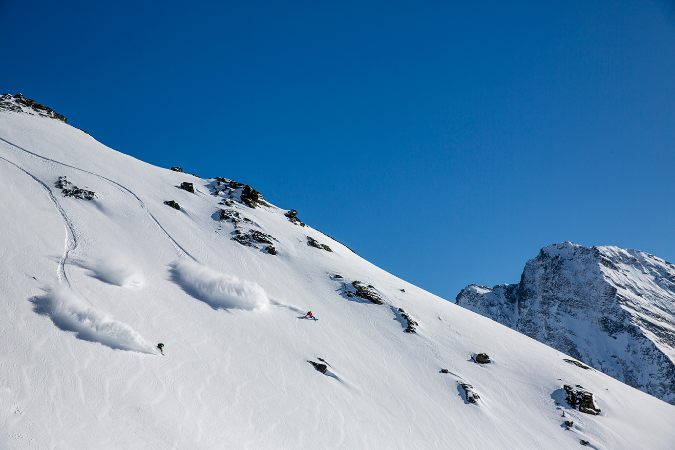 Ich nehme eigentlich jeden Tag im Backcountry die selbe Kombination mit, nachdem man nie weiß, wie das Wetter vielleicht während des Tages umschwingt. Ich trage einen technischen First Layer und Mikro-Fleece-Shirt, über das ich dann Jacke und Hose anziehe, die zwar hart und wasserdicht, aber dennoch leichtgewichtig sind. Außerdem habe ich immer eine Daunenjacke im Rucksack für extra Wärme.
