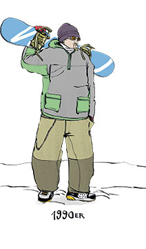 Dr. Alban, Snap und Take That hört die gameboyspielende Generation, während sie Tetris-Steine passgenau einparkt bis die Daumen dampfen. Passgenau scheint allerdings ein Fremdwort bei der ständig anwachsenden Snowboard-Gemeinde zu sein. Denn langsam aber sicher wachsen die Jacken und Hosen massiv in die Weite. Wer es schon kann lässt sich einen Ziegenbart wachsen und knöpft seine Geldbeutelkette zum Sound von Beastie Boys, Rage Against the Machine oder Pennywise an die XXL-Hose. Richtig cool ist, wer die Stichsäge zückt und sein teuer erstandenes Snowboard an Nose und Tail sowie an den Highbacks kürzt. Die Sonnenbrille muss am besten eine Catfish oder Superfly sein, die mit Hilfe einer Rasta-Matte oder blondierten kurzen Haaren den perfekten Style nach der Landung von Stiffies, Shifties und Straight Legs abgeben. Eine gewisse Who-Cares-Einstellung gegenüber allem Normalen gehört zum guten Ton, man ist ja schließlich Snowboarder!