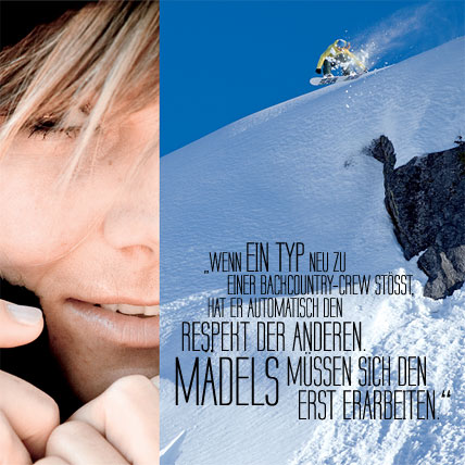 So überholt, wie es mir manchmal erscheint, es ist ja schon auch berechtigt. Wir sind nun mal nicht gleich, und egal wohin du als Mädel kommst im Snowboarden, du musst dich immer erst mal beweisen. Wenn ein Typ neu zu einer Backcountry-Crew stösst, hat er automatisch den Respekt der anderen. Mädels müssen sich den erst er arbeiten. Ich spüre im Moment aber in der ganzen Szene einen Wandel. Ich werde von Mädels interviewt, fotografiert, sie sind meine Ansprechpartnerinnen bei Sponsoren und Filmproduktionsfirmen… Wir übernehmen langsam, aber stetig mehr vom Ruder und es macht einfach mehr Spass, mit Mädels zusammenzuarbeiten. [lacht]