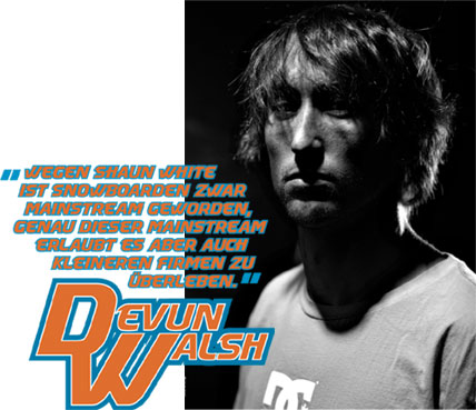 Beim Snowboarden darüber zu sinnieren, wie lange ein Pro grundsätzlich Karriere machen kann, war bis vor nicht allzu langer Zeit überflüssig. Zu jung war der Sport, mit zu wenig gestandenen Männern, die bereits als alte Hasen hätten bezeichnet werden können. Langsam aber sicher häufen sich die 3en auch auf den Rücken der Snowboard-Pros. Gesunde Ernährung, wenig Alkohol, viel Schlaf, intensives Krafttraining oder seriöse Frauen an ihrer Seite nennen die Pros als Gründe für ihren andauernden Erfolg. Dass das alles nicht nur unbedeutendes Gelaber ist, beweist Devun Walsh. Nach den Wirren um seinen Sponsorenwechsel von Forum zu DC rückte Devun in seinem ersten Jahr in den 30igern gleich mit drei Videoparts heraus und zeigte damit, wieso ihn DCP bereits als einflussreichsten kanadischen Snowboarder aller Zeiten betitelte. Mit Devun Walsh im Interview sprechen 15 Jahre Pro-Erfahrung über eingschlagene Autoscheiben, gefällte Bäume und ruinierte Firmen.
