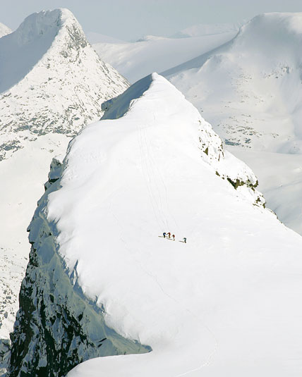 Es gibt Momente im Leben, über die man einfach lieber lachen als sich ärgern sollte. Genau solch ein Moment, der kalte zweieinhalb Stunden dauerte, war die Geburt dieses Fotos. Als wir diesen Bergrücken vom Betrachterpunkt aus sahen, wollten wir die Aufnahme machen. Es waren keine Spuren im Schnee zu sehen, weshalb wir das Gefälle nicht einschätzen konnten. Die vier Jungs machten sich also auf den Weg, während Filmer Humbi von MMP und ich auf dem Gipfel warteten. Der Wind fegte die Kälte durch unsere Klamotten und liess das Warten zur echten Herausforderung für uns werden. Kurz vor dem Gefriertod bauten Humbi und ich einen Mini-Shred auf dem Gipfel und sprangen One-footer und sonstigen Schabernack, um zu überleben. Endlich, nach zweieinhalb Stunden hatte das Warten ein Ende und die Jungs tauchten am Gegenhang auf. Per Walkie-Talkie erreichte uns die Botschaft, dass der Rücken so flach wäre, dass sich das Filmen nicht lohnen würde. Und tatsächlich, die vier Schweizer krochen nach dem Drop-in den Berg hinunter, so dass ich tatsächlich genug Zeit hatte, mein Objektiv während der Straight Line zu wechseln. Zum Glück waren wir ein Haufen Chaoten, die über sich selber lachen konnten! Das Foto wurde nicht nur im MBM abgebildet, sondern auch in anderen europäischen und amerikanischen Magazinen.