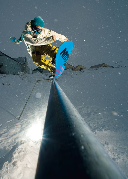 Ein Bild mit Seltenheitscharakter. Lukas Goller, bekannt für stylishe No-hand Tricks und Fs Spins im Powder, musste sich den widrigen Schneebedingungen im argentinischen Winter 2007 beugen. Anstatt den Trip für gescheitert zu erklären, liess sich der Südtiroler Evergreen auf Neues ein. Direkt hinter unserem Apartment stand dieses Fussballtor und gab uns an diesem Schlechtwettertag einen Steilpass. Lukas’ Plan: den Anfahrtsschneehaufen runter und den Takeoff hoch, dann abspringen und mal schauen, was passiert… Er muss in seinem früheren Leben eine Katze gewesen sein, denn genau wie im Powder landete der neugeborene
