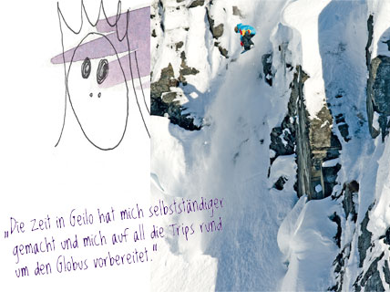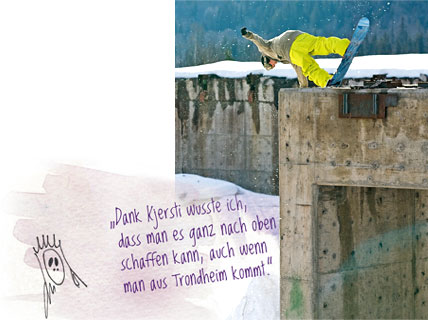 Eine super Zeit! Die meisten norwegischen Snowboarder waren da. Ich bin mit 16 Jahren nach Geilo gezogen, um von einer Schulleitung zu profitieren, die Verständnis für alle Trips zu Contests und für Fehlzeiten hat. In Geilo hast du zwar nicht wirklich jemanden, der dir beibringt zu snowboarden, man lässt dir aber Zeit, um selbst zu trainieren oder zu Contests zu fahren. Ansonsten läuft alles wie auf einer normalen Schule. Die haben da auch nicht so was wie ein Internat bei der Schule mit dabei. Man mietet sich stattdessen alleine oder zusammen mit Freunden eine Wohnung. Ich wohnte mit einem Freund aus meiner Klasse zusammen.