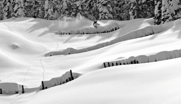 Es ist der absolute Wahnsinn! Die Board-Shapes, die ich entwickelt habe, fahren unglaublich gut im Powder. Ich werde nie wieder ein herkömmliches Brett im Tiefschnee nutzen, es sei denn, ich will Sprünge oder technische Lines fahren. Die Bretter gleiten so unheimlich gut und es fühlt sich super an, wenn du Kurven fährst! Darüber hinaus kannst du sie auch einfach in richtig tiefem Schnee auf flachem Gelände nutzen. Das erste Brett, das ich je ausprobiert habe, nannte ich „Porsche“. Mit Schneeschuhen ausgerüstet stieg ich einen Berg nahe Donner Summit, Tahoe, rauf. Als ich dann losgefahren bin und meinen ersten Frontside Turn zog, wusste ich, dass ich etwas Einzigartiges geschaffen hatte. Das Brett schwimmt unglaublich gut im Powder auf und gleitet wahnsinnig schnell. Normalerweise ist mir beim Powdern immer der ganze Schnee an die Beine geflogen und ich bin eingesunken, wenn ich nicht richtig schnell fuhr. Da der „Porsche“ aber so groß ist, konnte ich trotz des vielen Schnees und der geringen Neigung riesige Sprays ziehen.