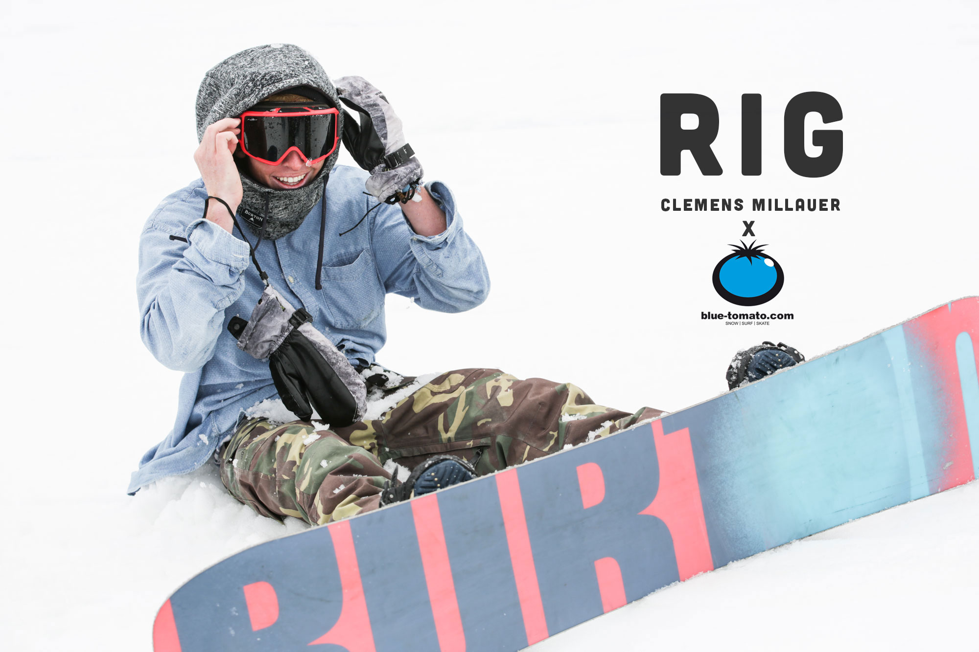 Jetzt aber soll uns der junge Österreicher mit den herausragenden Park-Skills erstmal sein feines Freestyle-Setup vorstellen. Ein Setup, dass seinem Sponsor Blue Tomato wohl sehr am Herzen liegt, hätten sie wohl nicht die ganze Bude damit vollgestopft….