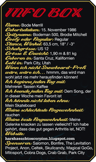 „Bode Merrill verschwunden“ wäre fast anstelle dieses Interviews hier gestanden. Er weiß wie man sich versteckt oder wie man einfach mal das Spiel „nichts hören und nichts sehen“ spielt. Denn wer denkt, dass es schwer wäre Terje Haakonsen, Shaun White oder Travis Rice für ein Interview zu bekommen, der sollte erst einmal versuchen sich mit Bode Merrill an einen Tisch zu setzen bzw. zu einem Skype-Gespräch zu verabreden. Der 24-jährige aus Park City kann sich derzeit kaum vor Interviewanfragen retten nachdem er in Absinthes „twelve“, gleich zwei komplette Videoparts als Abschluss des Films scoren konnte. Wer diese beiden Filmparts, unterteilt in Street- und Backcountry-Aufnahmen, sieht, wird schnell verstehen warum Bode zur Zeit als heißestes Eisen im Snowboardfeuer gehandelt wird. Man hätte fast denken können, dass er einfach keine Lust hat. Wenn man ihn dann aber doch zu sprechen bekommt, ist man über seine Ehrlichkeit und Offenheit verblüfft. Was hinter dem unscheinbaren Salomon-Pro steckt, wie faustdick er es hinter den Ohren hat und was er über Contests und Rocker-Boards denkt, erfahrt ihr hier im Interview.